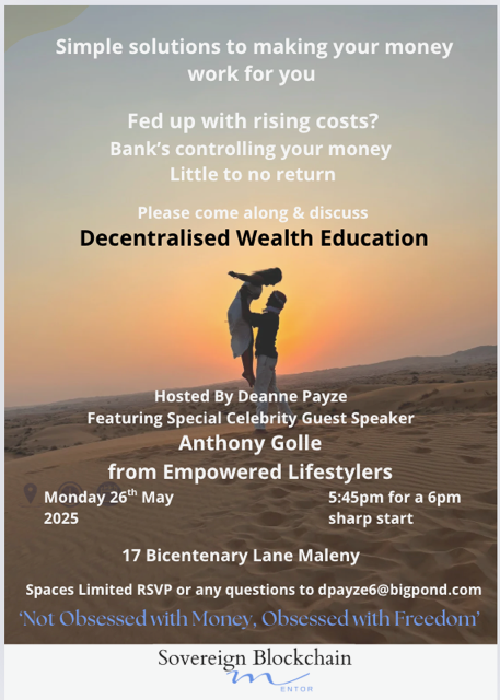 On the 26th May we have Anthony Gollé who will provide us information on Decentralised Wealth. This session will be hosted by Deanne Payze who is a local, who has successfully used the methods